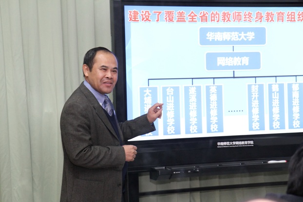 许院长在会上从“教师远程教育服务体系构建,教师远程学历教育,教师远程非学历培训,承担教育部重大项目”四大方面向葛副司长等领导汇报了我院在教师远程培训方面的探索与实践。目前,我院构建了以华南师范大学为主体,市县中小学教师培训基地为支撑,“培训机构上移,培训基地下移”,“天网、地网和人网”三网合一的教师终身教育组织体系。许院长指出,我院率先推出网络教育学分银行,建立起教师学历教育与非学历培训的衔接和沟通机制,有效避免了重复培训和降低了学习成本。此外,我院在教师职业教育、特殊义务教育教师远程培训、高校教师远程培训、教师职前培养与职后培训等方面也积累了许多实践经验。