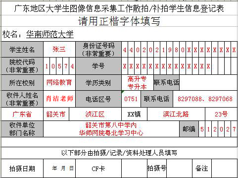 3、个别错过集中拍摄时间的学员请在11月30日前直接与新华社广东分社联系,可到新华社广东图像采集中心下设的采集点补拍,网院不再作安排。相片请邮寄交回教学中心(地址:韶关市i浈江区滨江路23号第八中学内华师网院韶关学习中心 肖洁老师收 邮编:512027);新华社广东图像采集中心地址:广州市越秀区府前路21号205(府前路位于广州市人民政府西面300米,广东迎宾馆斜对面),联系电话:020-83302077。