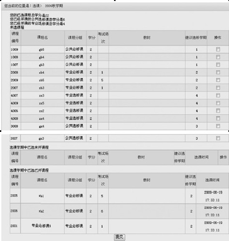 3、完成填写学籍表之后,进入“学生工作室”首页,左侧有一列功能按钮,点击“选课”,在右边窗口列出本次可选课程,在将要选的课程后面相对应的复选框□打“√”,核对所选课程无误后,点击窗口下端的“提交”按钮(见下图),系统将会提示“选课成功”。在“选课学期中已选未开课程”,将列出本次所选课程列表。