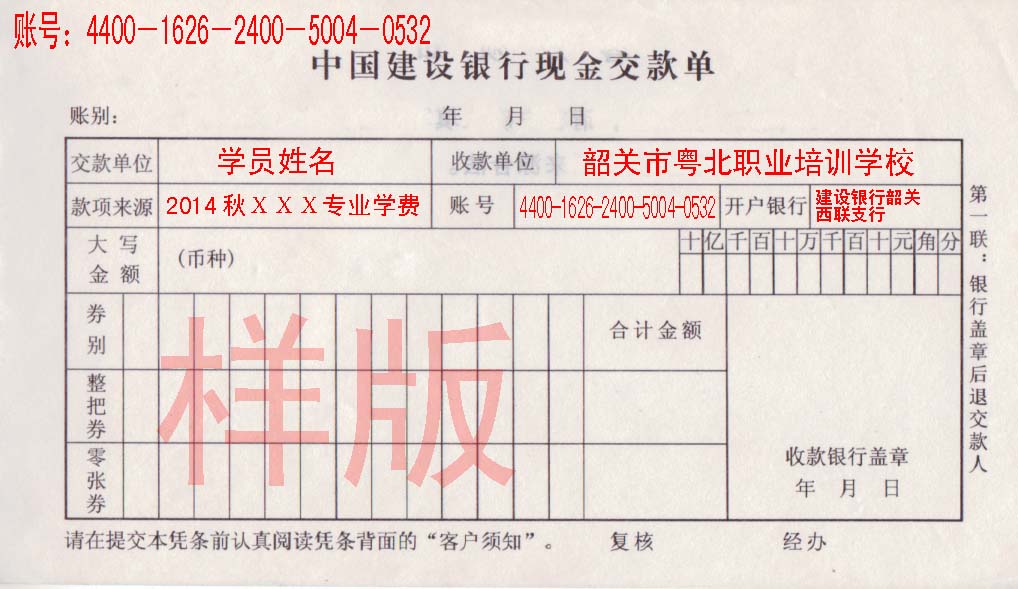 1)银行柜台办理办法:本次缴费由韶关学习中心代收代缴,通过广东省建设银行现金或汇款方式办理。请您在规定的交费时间内,到广东省内任意一家建设银行营业网点(深圳市除外),向营业员索取一式二联的“中国建设银行现金交款单”(见附图)并按要求填写,待营业员核对交费资料无误后,采用建行的存折、现金等方式办理交费。
