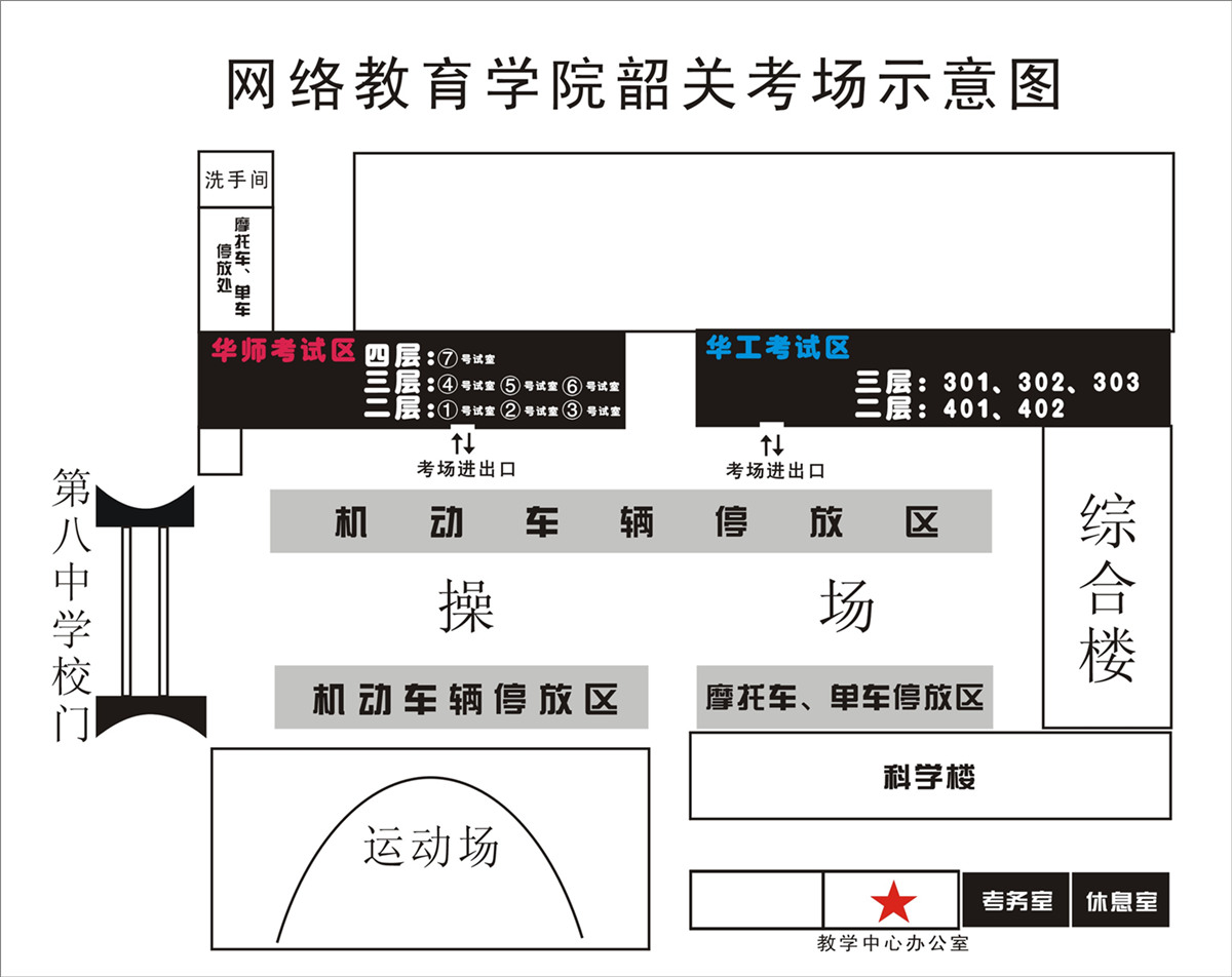 8、考生汽车、摩托车等交通工具可停放在第八中学蓝球场处(综合楼门前20米、教学中心办公楼前禁停一切车辆)。