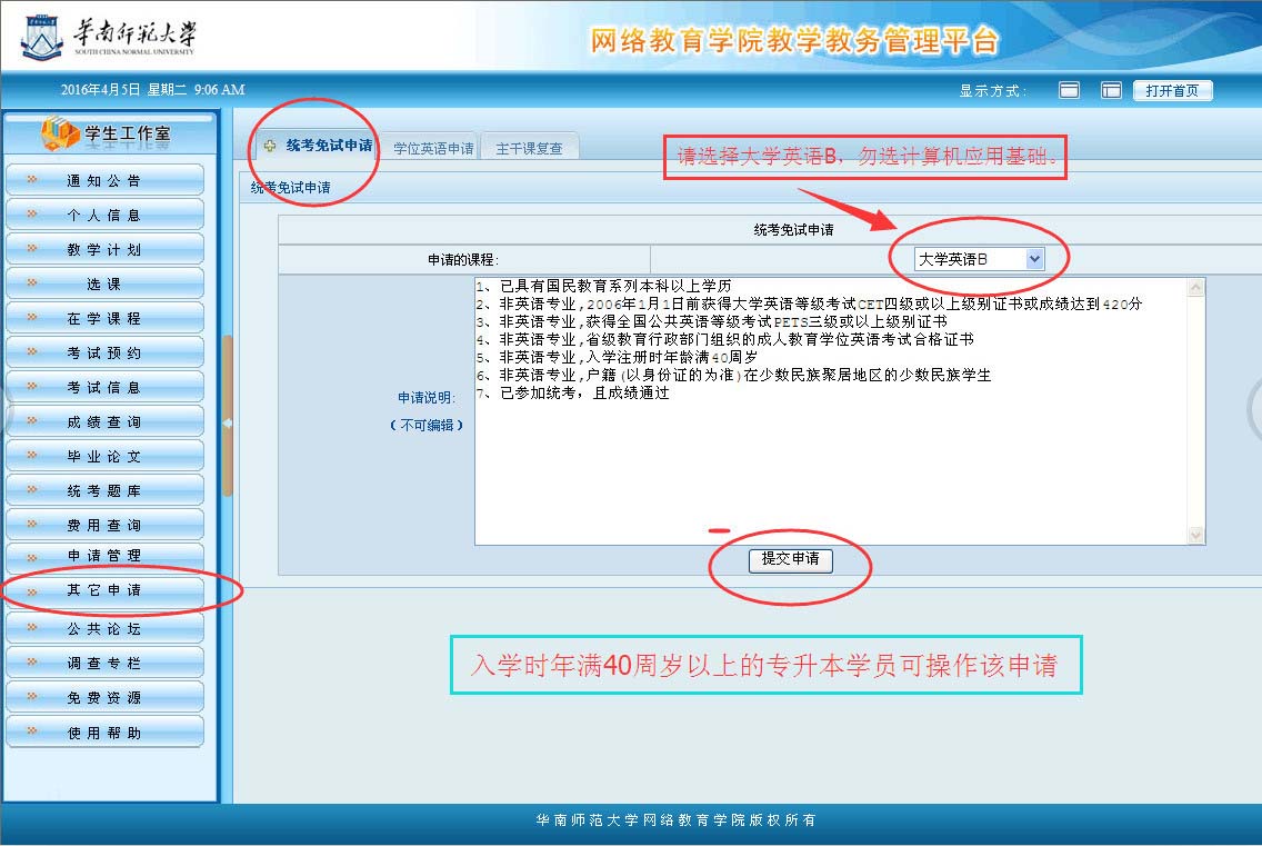 3、免考网上申请时间:2017年5月7日--15日。此次申请时间过后,本学期不再开放其它申请时间,请需要申请的学员及时办理,若因错过申请导致无法及时毕业的,后果自负。