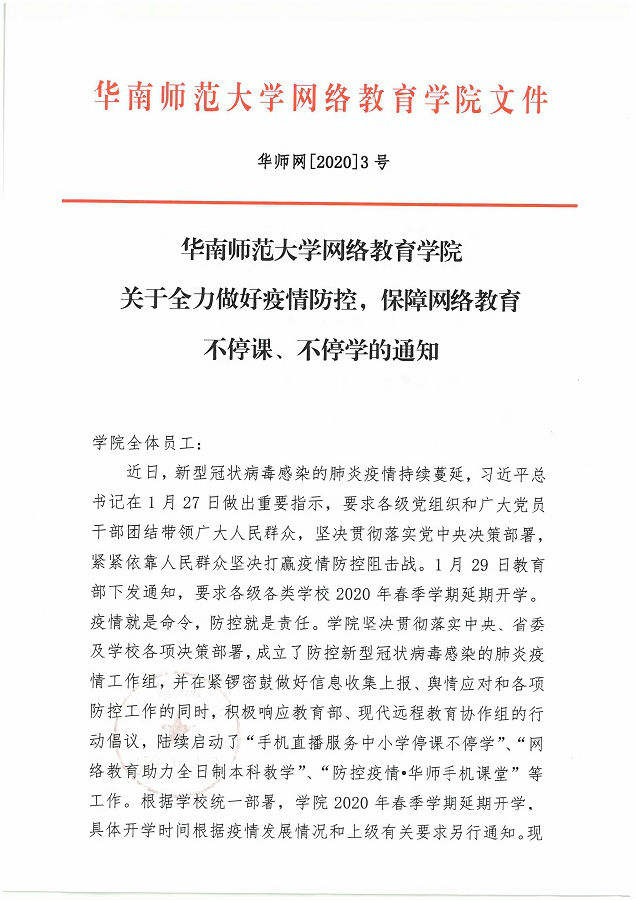 华南师范大学网络教育学院关于全力做好疫情防控,保障网络教育不停课、不停学的通知