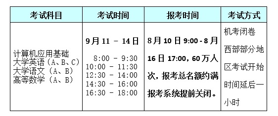 (3)《计算机应用基础》、《大学英语》(A、B、C)、《大学语文》(A、B)和《高等数学》(A、B)四门统考课程全部采用混编考场方式。报考时间如下: