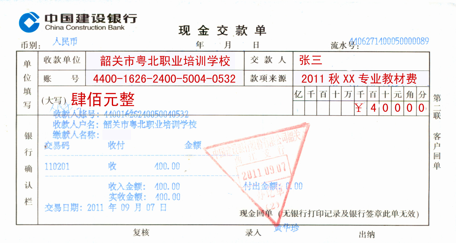 ①2011秋新生学员于09月10日-09月24日期间自行到广东省内各农业银行网点(深圳地区除外)交费(注册现场不收现金)。