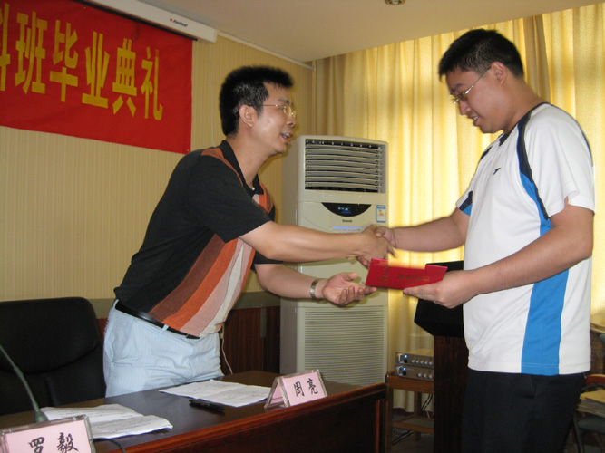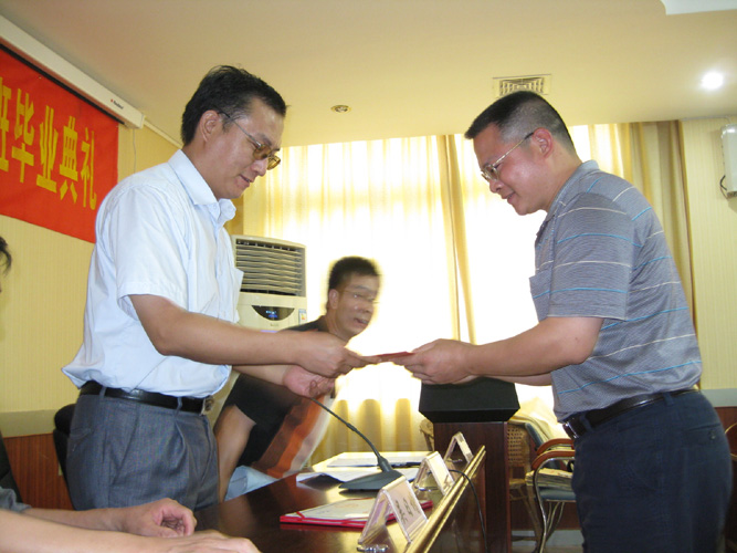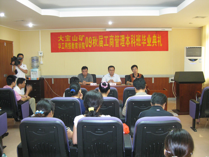 7月23日下午,2009年秋届工商管理(大宝山系统班)的学生毕业典礼在大宝山矿业公司会议厅隆重举行。华南理工大学网络学院院长罗毅、大宝山矿业有限公司党组书记吴日增及韶关教学中心领导出席毕业典礼。在会上,网络学院院长代表学校作了重要讲话,并亲自向系统班毕业生颁发毕业证书。他真诚祝愿同学们毕业后工作顺利,事业成功,为母校争光。