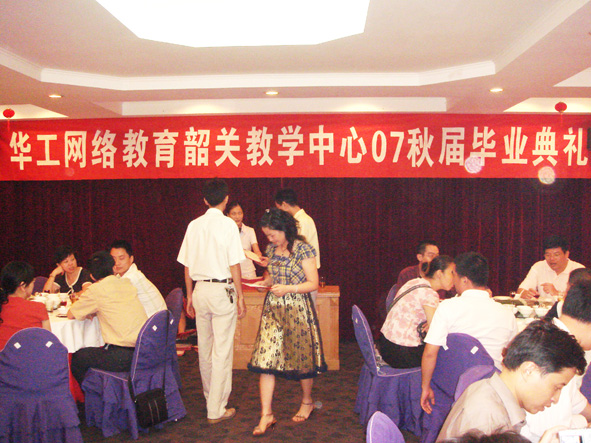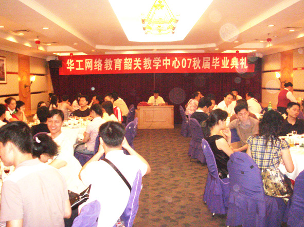 本月29日上午,2007年秋届学生毕业典礼在韶关市流花宾馆宴会厅隆重举行。华南理工大学网络学院韶关教学中心领导及各班班主任出席了毕业典礼。在会上,教学中心领导周亮主任代表学校作了重要讲话,并亲自向本届毕业生颁发毕业证书。他真诚祝愿同学们毕业后工作顺利,事业成功,为母校争光!